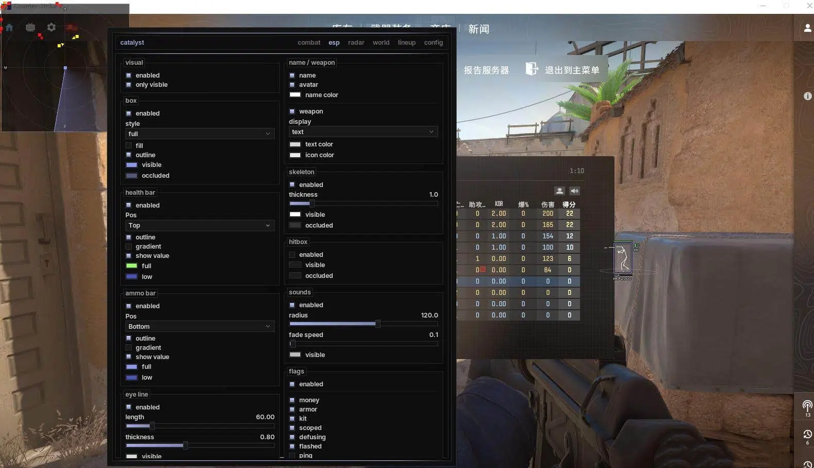 金钱 | 护甲 | 携带C4 | 拆弹器 | 开镜 | 拆弹中 | 换弹 | 闪光致盲 | 延迟 | 位置 | 距离