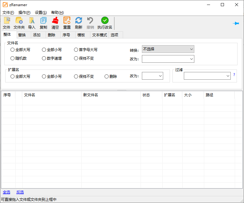 zRenamer批量改名工具是一款绿色便携且小巧实用的高效批量重命名工具.zRenamer绿色版支持拖拽/右键操作与正则替换,提供文本自由改名及模板自定义,集成插入/替换/序号等9种改名模式,文件列表管理等功能.